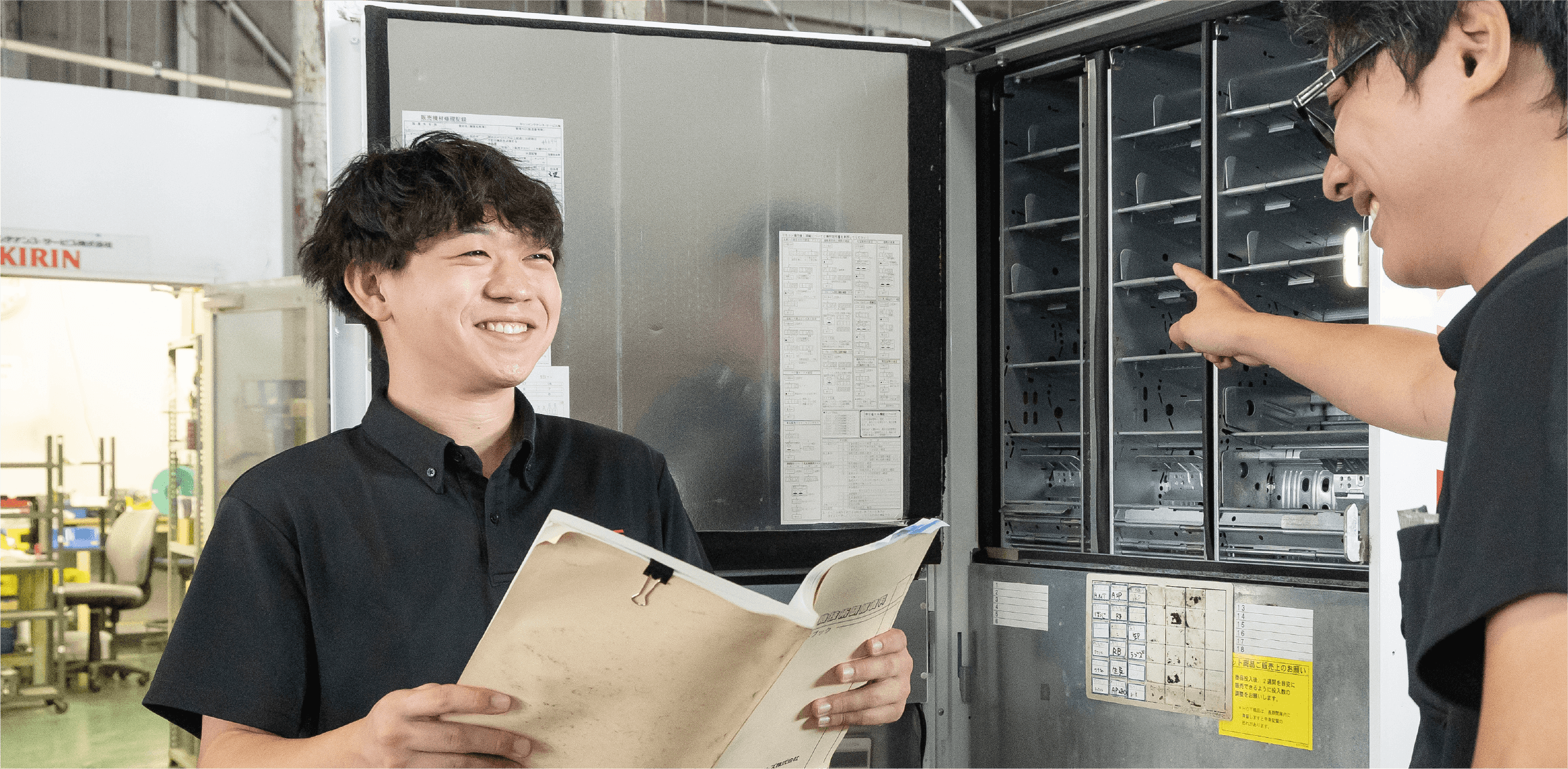 子どものころから機械が好きで、高校も工業高校を選び、機械科で学んでいました。自販機も暮らしのなかで間近に見る機械です。内部がどういう仕組みになっているのか、とても興味がありました。街でオペレーターの人が扉を開けているときなど、ずっと側で見ていたいと思うほどで、学校にキリンから求人があると知ったときは、絶対この会社に入って自販機に関わる仕事がしたいと思い、それが入社につながりました。