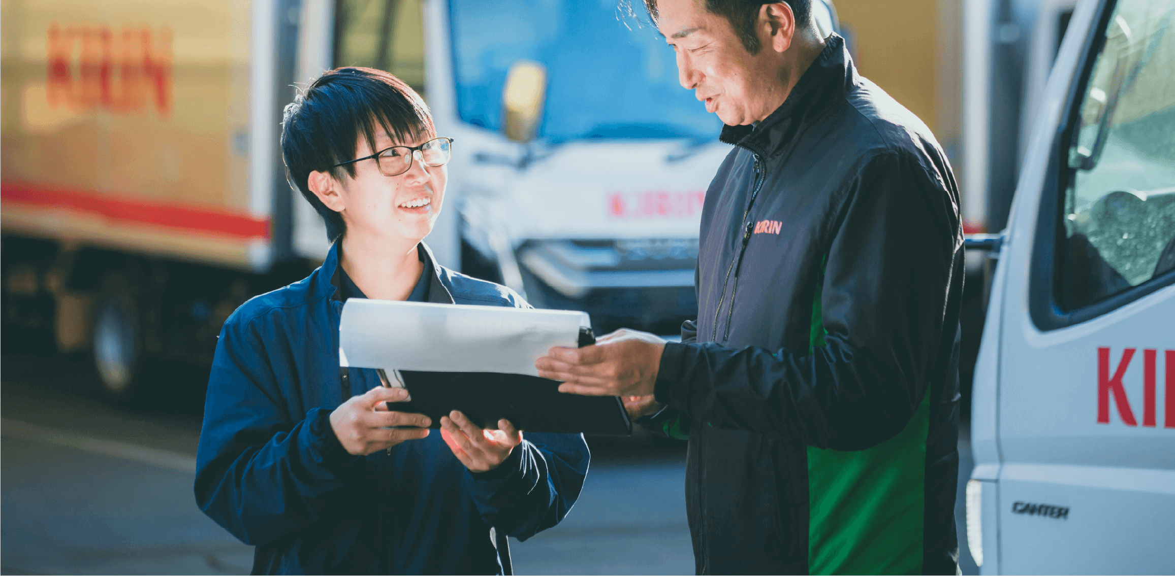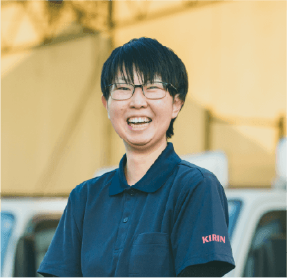 私は長く医療機関で働いていたのですが、経験年数を重ねていくにつれて期待されるものがどんどん大きくなり、押し潰されそうになっていました。思い切って転職しようと考えて選んだのが今の仕事です。自分に合った仕事はなんだろう? いろいろ考えました。自動車の運転が好きなので、それを活かして人に貢献できる仕事を考えていくと、宅配や引っ越し、運送会社などが思い浮かびました。でもどこかしっくりきません。そのときに私の目に飛び込んできたのが自販機です。差し入れなどでもらうとうれしいし、疲れたときにちょっと飲めてほっとすることができる……身近すぎて気が付かなかったけれど、自販機は人の心を温かくさせてくれる魅力的な存在です。そういえば午後の紅茶 ミルクティーは高校生のころからずっと飲んでいる私の青春そのもののような存在。体力仕事で大変かもしれないけれど、キリンビバレッジの自販機のオペレーターになり、飲料をとおして人に満足を届けられる仕事をしようと思い、入社しました。入社後は6カ月間の手厚い研修が用意されていて、不安なく独り立ちすることができました。